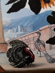 Particolare del tacchino e del pavone con costruzioni e monti come sfondo