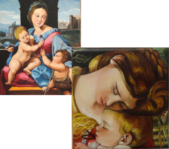 - Copie d’Arte a livello museale – Esegue Copie di dipinti ad olio sia su tela che su tavola, a seconda del periodo di riferimento e della richiesta del committente. E’ quindi possibile ricevere le opere dipinte con autentici colori ad olio, nel formato originale o nella dimensione richiesta, che saranno così Copie uniche corredate da “certificato di garanzia e unicità”.