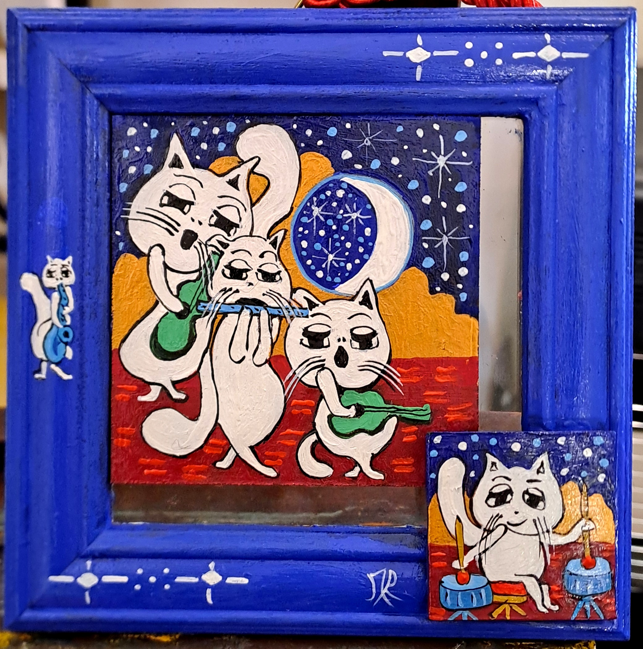 Opera originale, acrilico su tavola e ceramica, fondo in vetro, cornice in legno dipinta, cm 13,5 x 13,5
