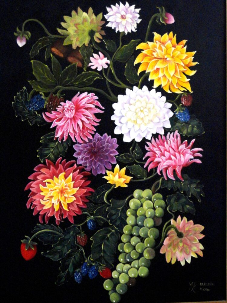 Questo dipinto ad olio su tela offre una visione intensa e personale del tradizionale tema della natura morta. Su uno sfondo di un nero profondo, emerge una composizione di fiori e frutta che cattura lo sguardo. Un tralcio di dalie, con petali di diverse tonalità, si snoda con grazia, mostrando la varietà e la bellezza di questi fiori. Tra le fioriture, piccoli frutti selvatici aggiungono un tocco di colore vivace, mentre un grappolo d’uva verde, con i suoi acini brillanti, crea un contrasto sorprendente con l’oscurità del fondo.