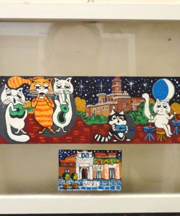 Lo stile è naif, con figure stilizzate e colori vivaci. La firma dell’artista è visibile sul biglietto. La scena è un inno all’irriverenza e alla creatività, dove la capra diventa un simbolo di anticonformismo.