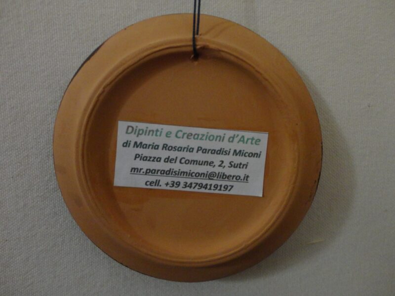 Questo piattino dipinto raffigura il Bambino Gesù, probabilmente ispirato a una tradizionale iconografia cristiana. È realizzato con la tecnica dell’olio su un supporto di ceramica, suggerendo una possibile funzione decorativa come piattino da muro.
