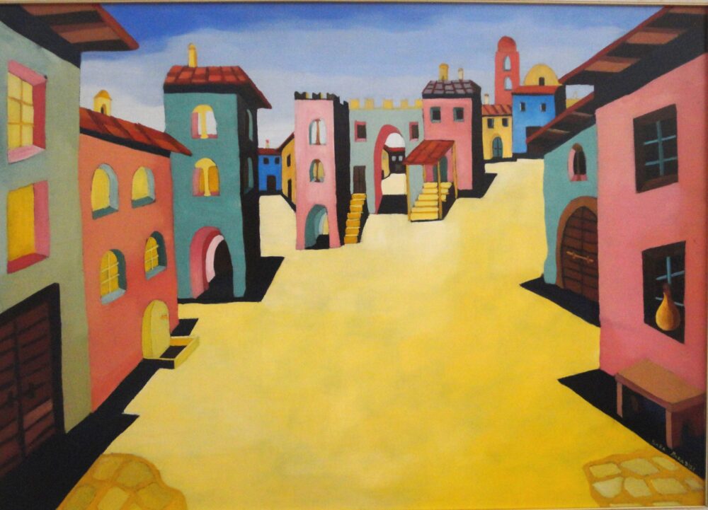 La chiesa, con il suo campanile svettante, si staglia all’orizzonte, rappresentando il punto focale del dipinto. Le ombre lunghe proiettate dalle case suggeriscono un’ora tarda del giorno, aggiungendo un senso di tranquillità e serenità alla scena. L’opera trasmette un senso di pace e armonia, tipico dell’arte naif. La strada che conduce alla chiesa simboleggia un percorso spirituale, un invito alla riflessione e alla contemplazione.